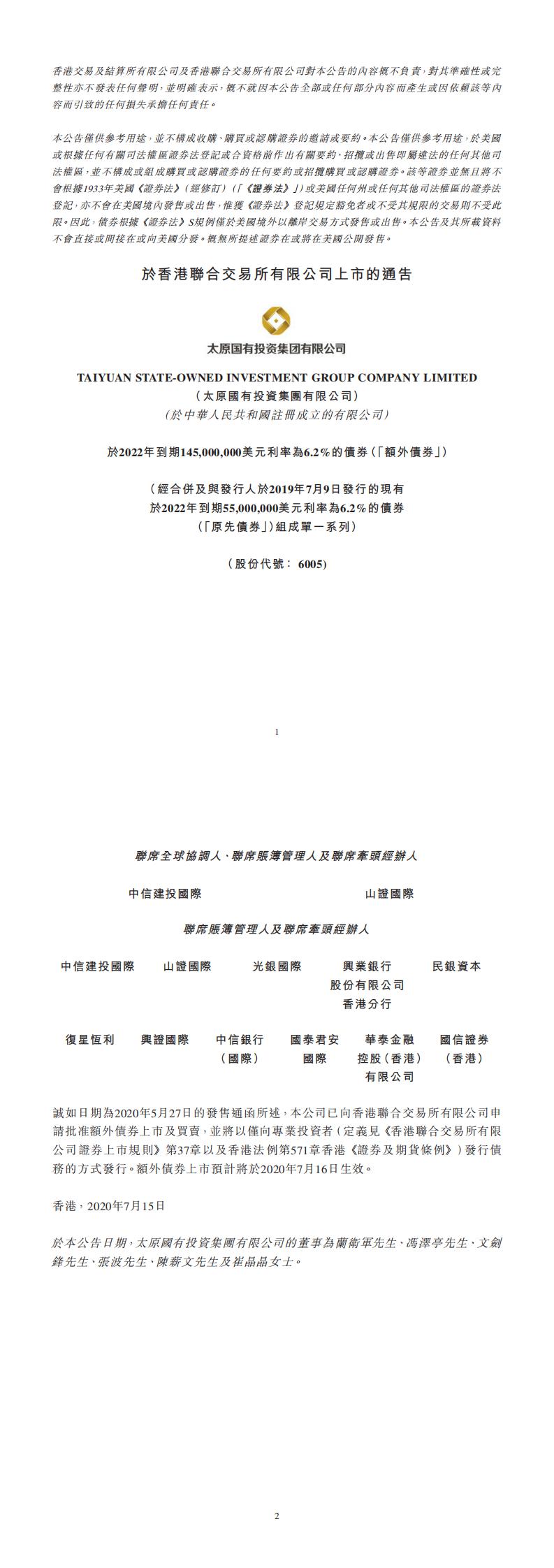 有關(guān)在香港聯(lián)合交易所有限公司上市的通知 — 太原國(guó)有投資集團(tuán)有限公司 — 發(fā)行於二零二二年到期金額為145,000,000美元的6.2%債券