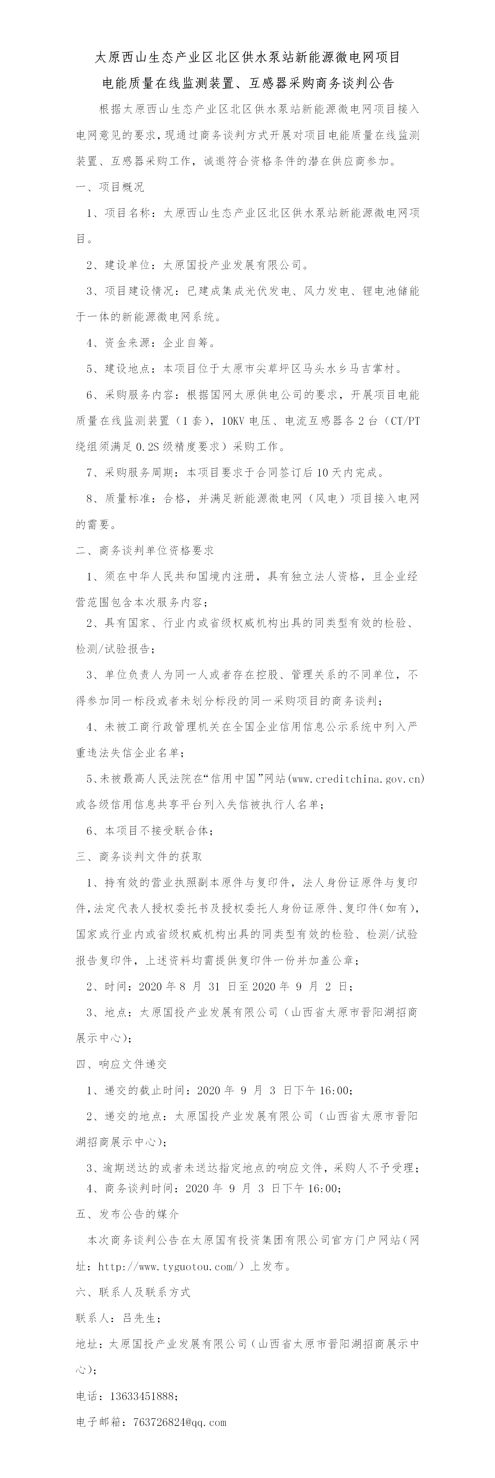 太原西山生態(tài)產(chǎn)業(yè)區(qū)北區(qū)供水泵站新能源微電網(wǎng)項(xiàng)目電能質(zhì)量在線監(jiān)測(cè)裝置、互感器采購(gòu)商務(wù)談判公告