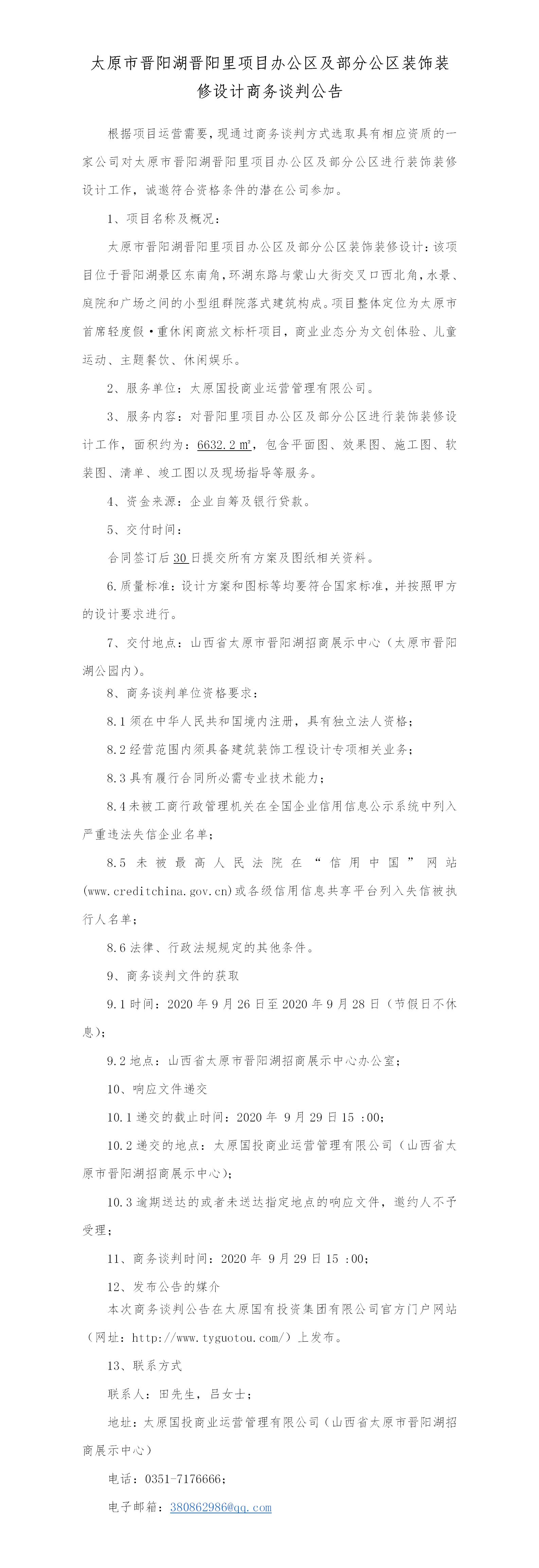 太原市晉陽(yáng)湖晉陽(yáng)里項(xiàng)目辦公區(qū)及部分公區(qū)裝飾裝修設(shè)計(jì)商務(wù)談判公告