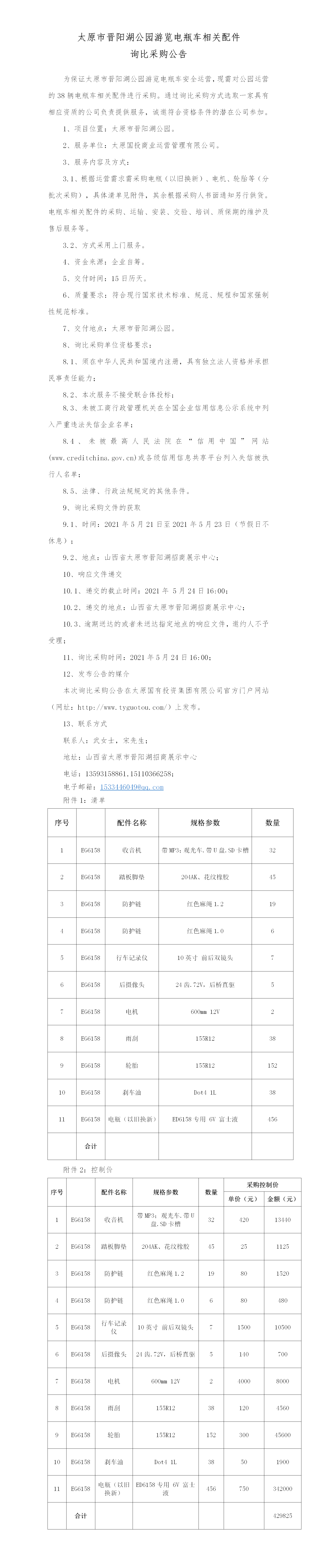 太原市晉陽湖公園游覽電瓶車相關配件詢比采購公告