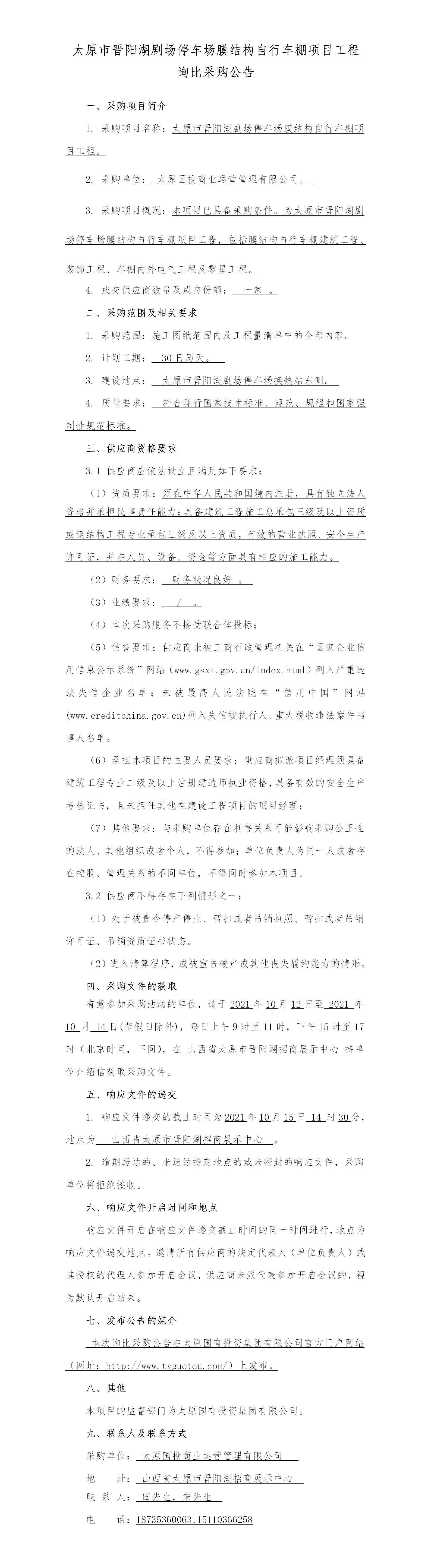 太原市晉陽(yáng)湖劇場(chǎng)停車(chē)場(chǎng)膜結(jié)構(gòu)自行車(chē)棚項(xiàng)目工程公告