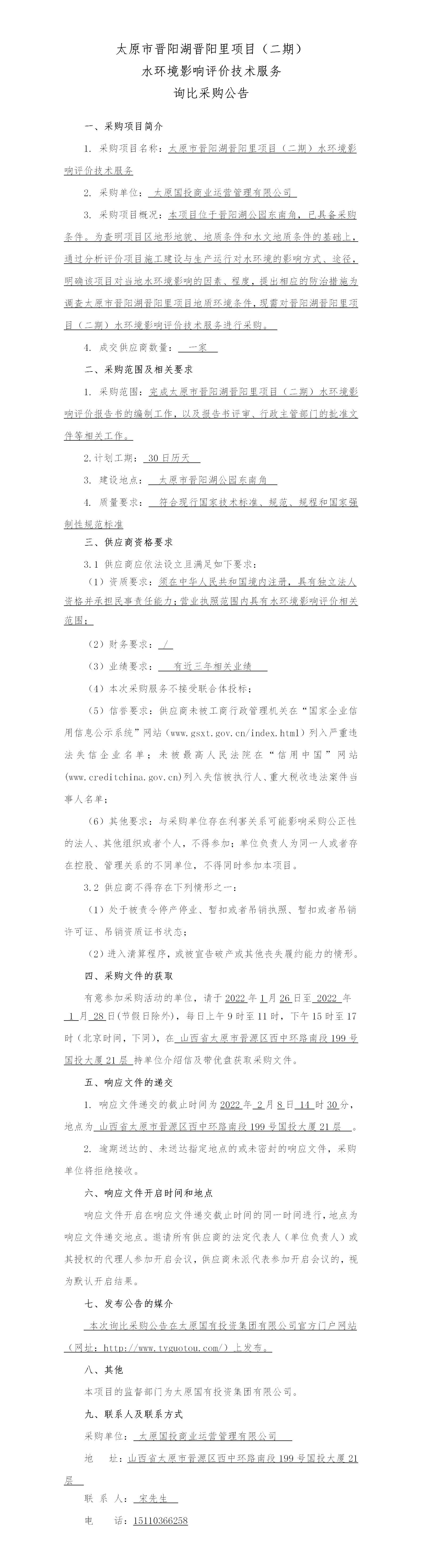 太原市晉陽湖晉陽里項目(二期)水環(huán)境影響評價詢比采購公告