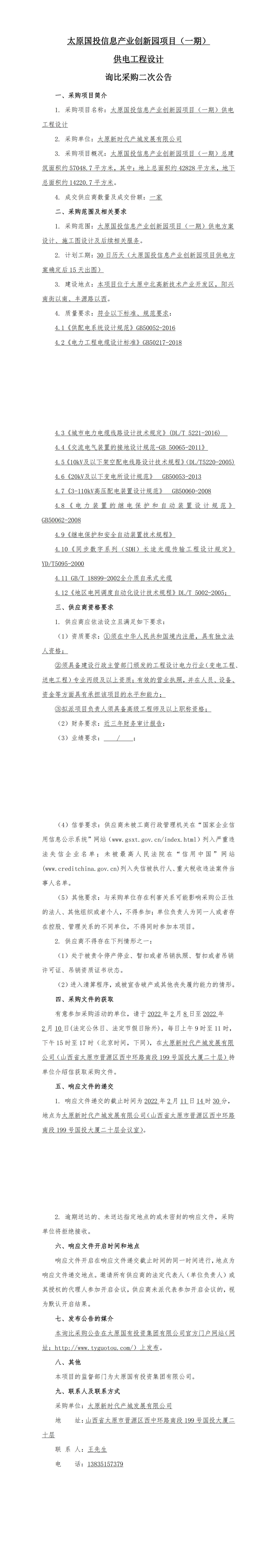 太原國(guó)投信息產(chǎn)業(yè)創(chuàng)新園項(xiàng)目(一期)供電工程設(shè)計(jì)詢比采購(gòu)二次公告