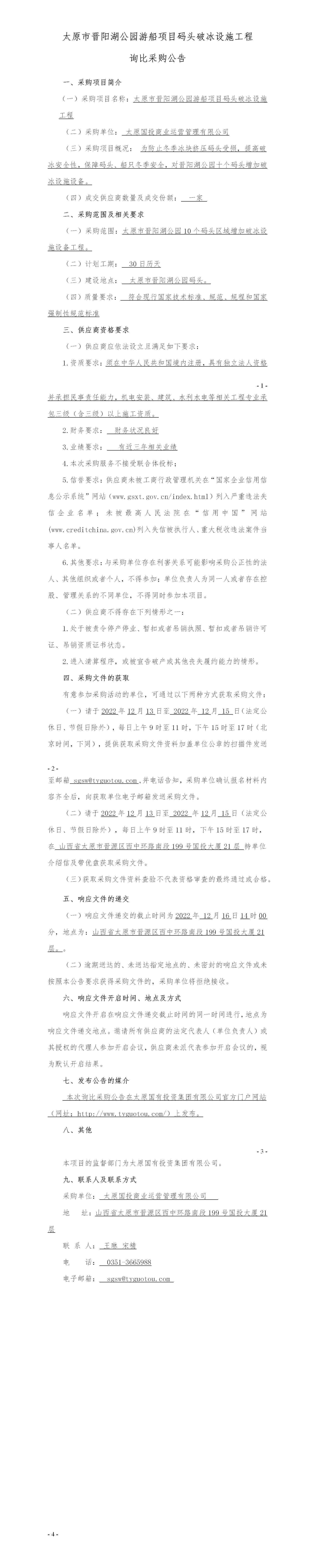 太原市晉陽湖公園游船項(xiàng)目碼頭破冰設(shè)施工程詢比采購公告
