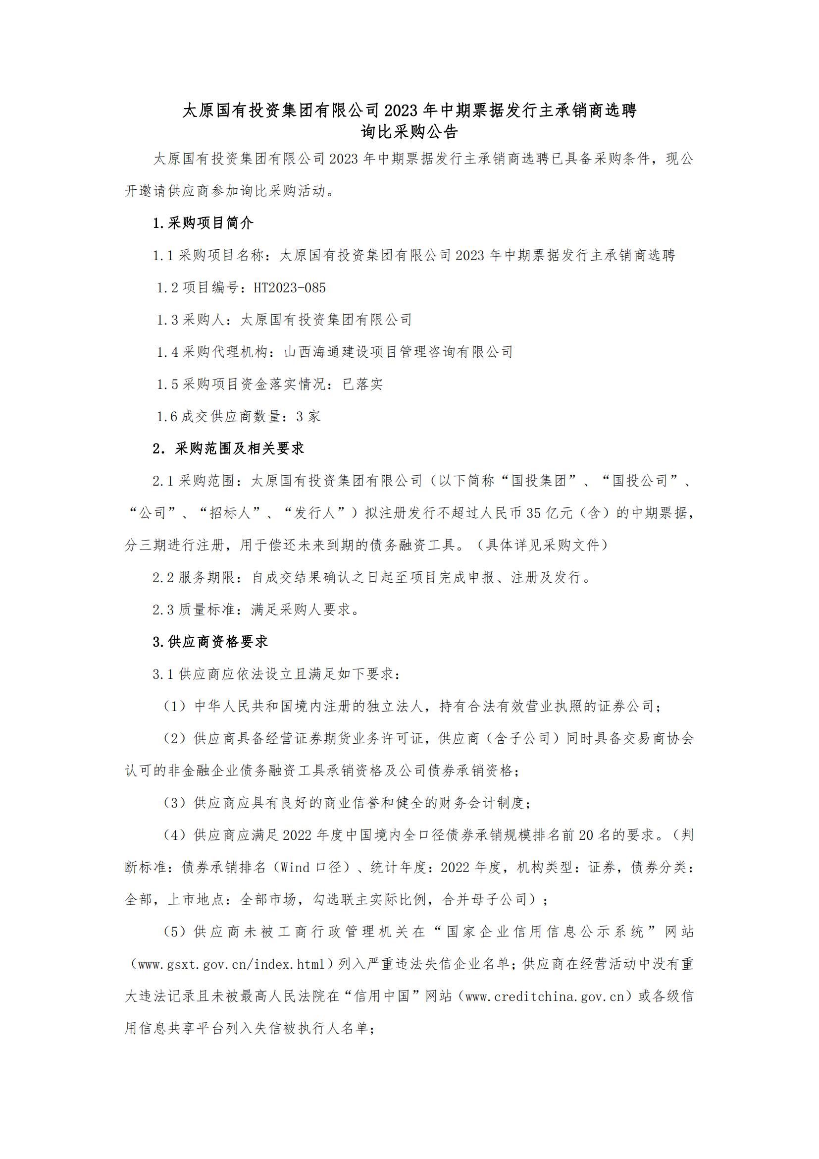 太原國(guó)有投資集團(tuán)有限公司2023年中期票據(jù)發(fā)行主承銷商選聘詢比采購(gòu)公告