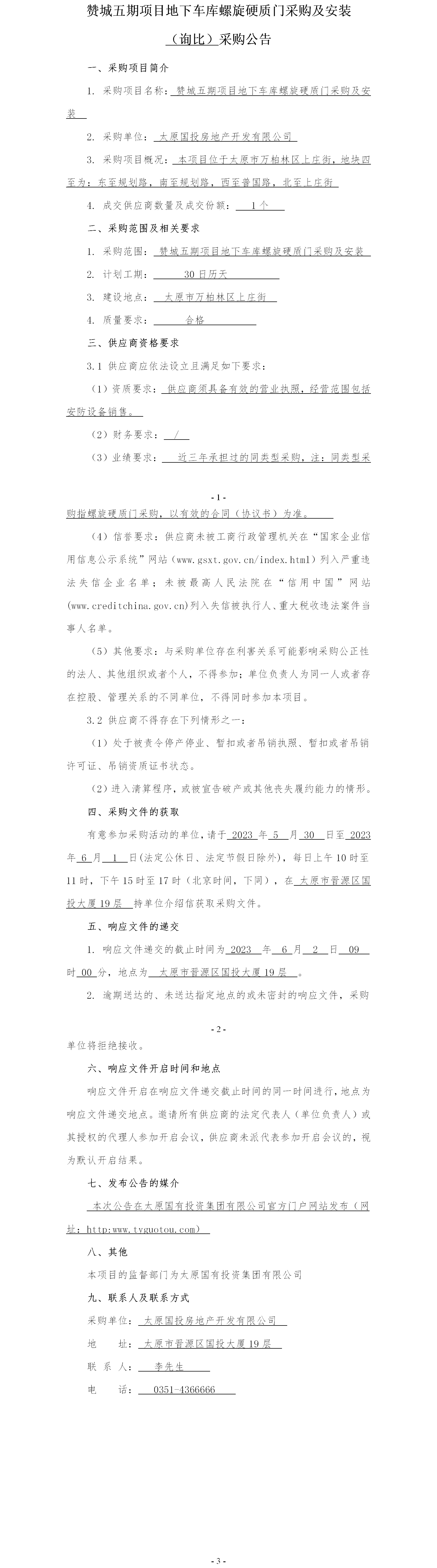 贊城五期項(xiàng)目地下車庫(kù)螺旋硬質(zhì)門(mén)采購(gòu)及安裝詢比采購(gòu)公告
