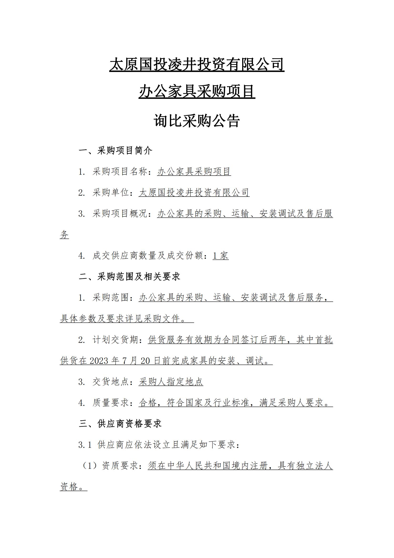 太原國投凌井投資有限公司辦公家具采購項目詢比采購公告