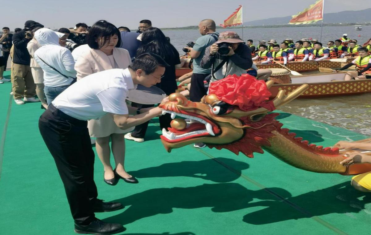 晉源區(qū)委書記張農(nóng)壽,晉源區(qū)長張耀,省文旅廳處長馮海明,國投集團董事長蘭衛(wèi)軍為本次活動的龍舟“披紅點睛”,一點天庭,吉星高照,鴻運當(dāng)頭;二點龍鼻,和諧幸福,萬家平安;三點口利,笑口常開,大吉大利;四點龍角,風(fēng)調(diào)雨順,國泰民安;五點龍睛,愿龍舟為大家?guī)斫】?、吉祥和如意?img src="/FileUpload/image/20230625/20230625100340_5153.png" alt="" />