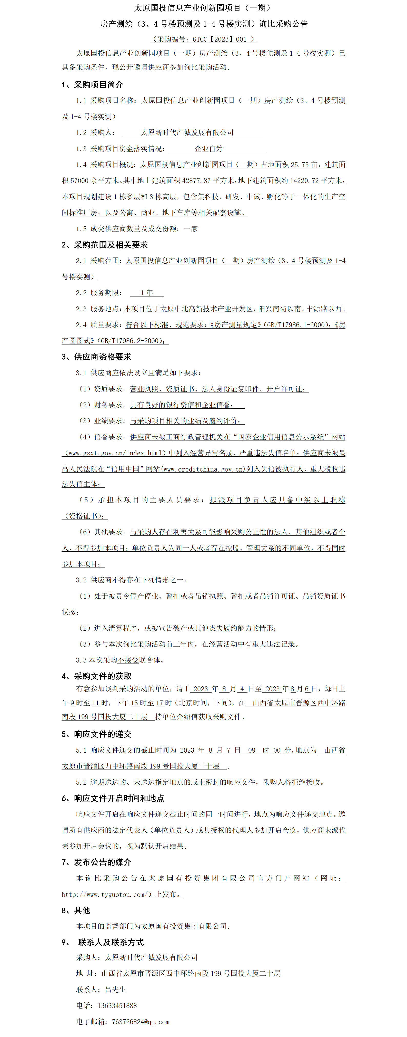 太原國投信息產(chǎn)業(yè)創(chuàng)新園項目(一期)房產(chǎn)測繪(3、4號樓預測及1-4號樓實測)詢比采購公告