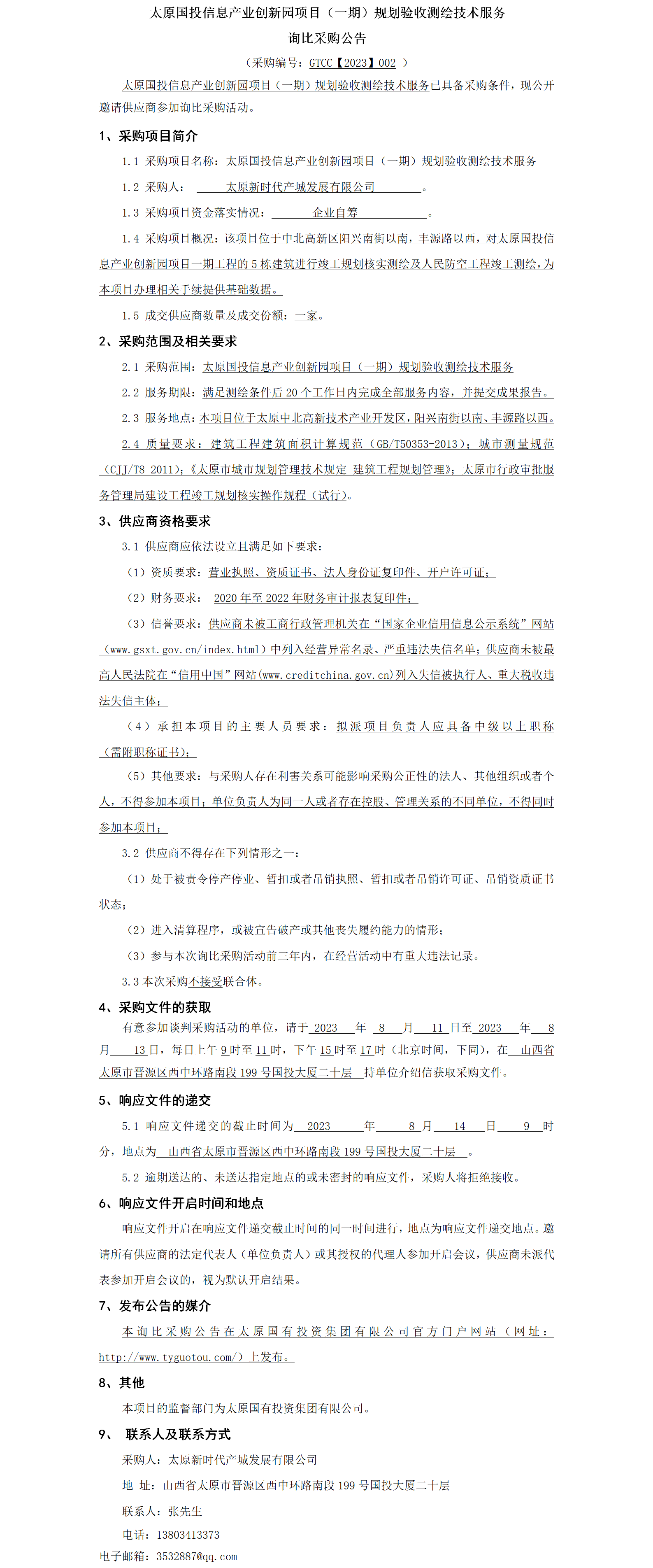 太原國投信息產(chǎn)業(yè)創(chuàng)新園項目(一期)規(guī)劃驗收測繪技術(shù)服務(wù) 詢比采購公告