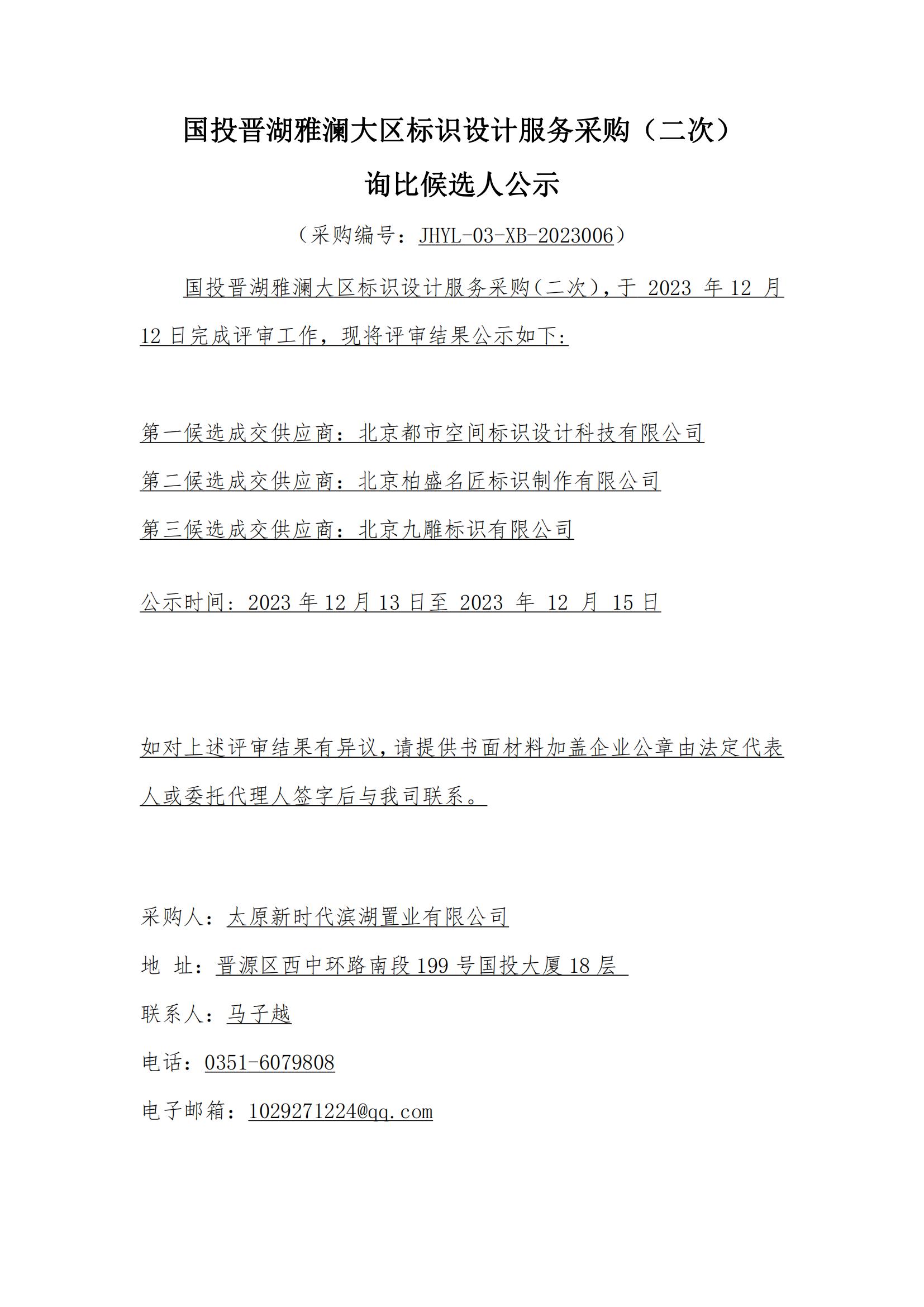 國投晉湖雅瀾大區(qū)標(biāo)識(shí)設(shè)計(jì)服務(wù)采購(二次)詢比候選人公示