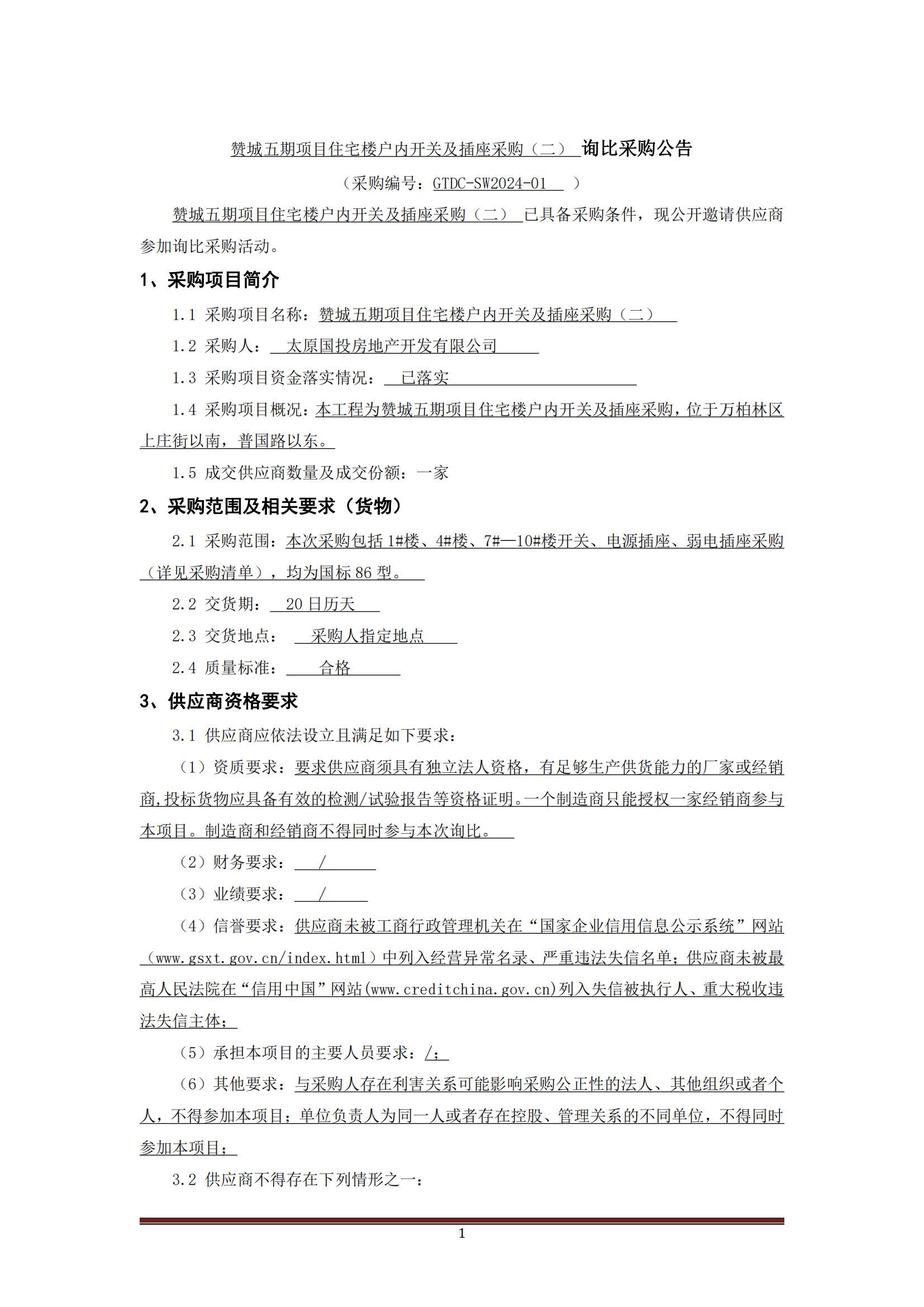 贊城五期項目住宅樓戶內(nèi)開關(guān)機插座采購(二)詢比采購公告