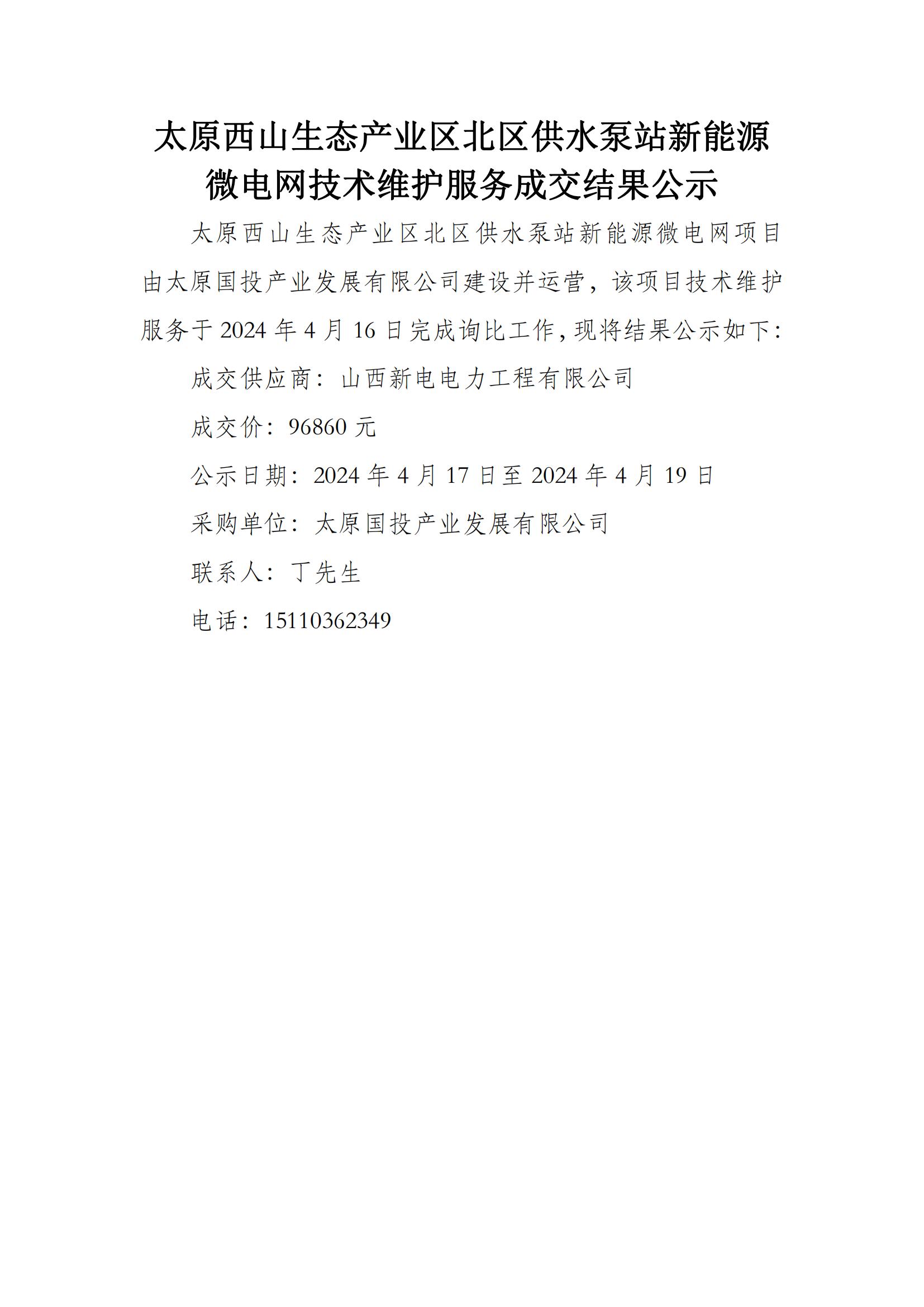 太原西山生態(tài)產業(yè)區(qū)北區(qū)供水泵站新能源微電網(wǎng)技術維護服務成交結果公示
