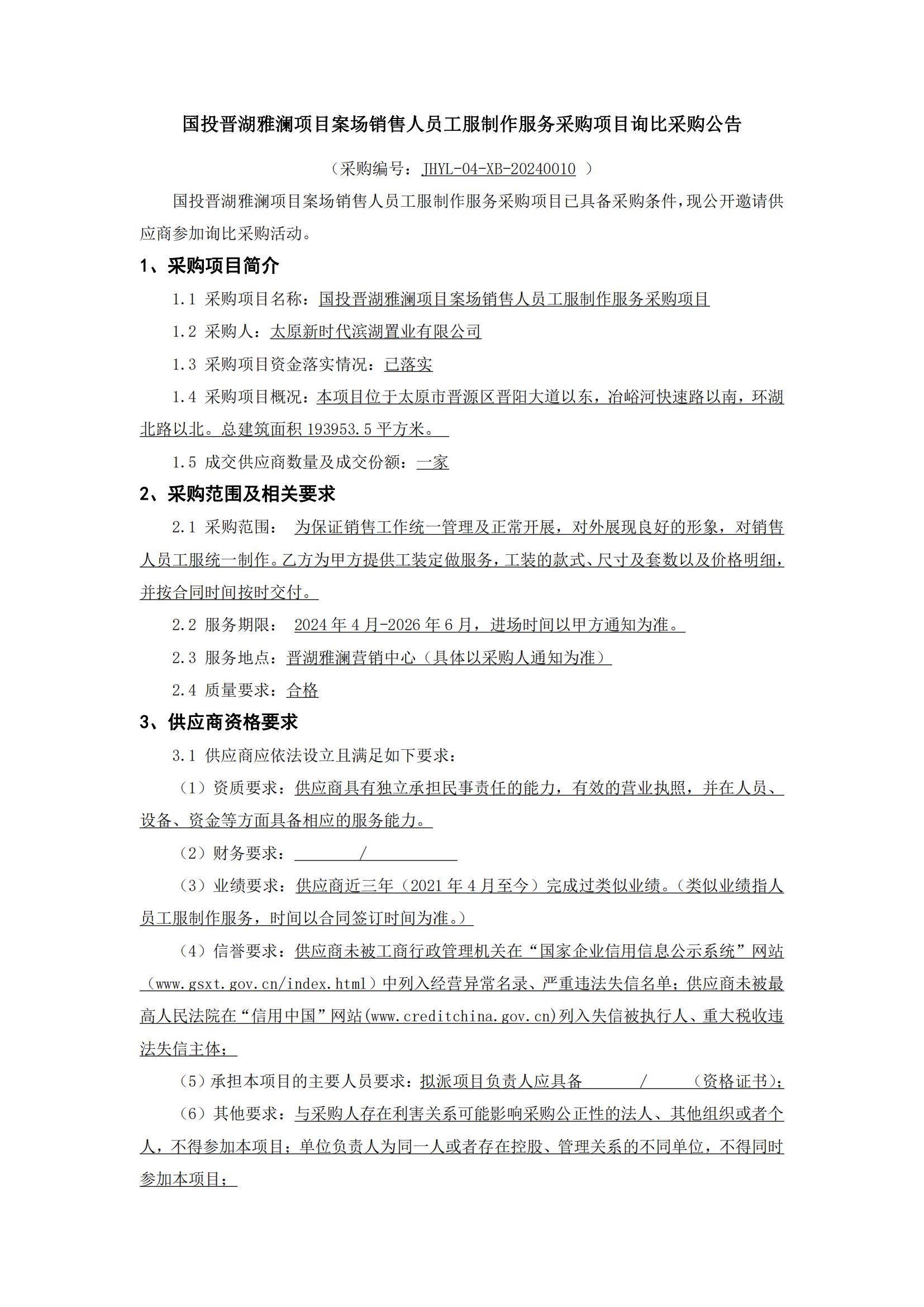 國投晉湖雅瀾項(xiàng)目案場(chǎng)銷售人員工服制作服務(wù)采購項(xiàng)目詢比采購公告