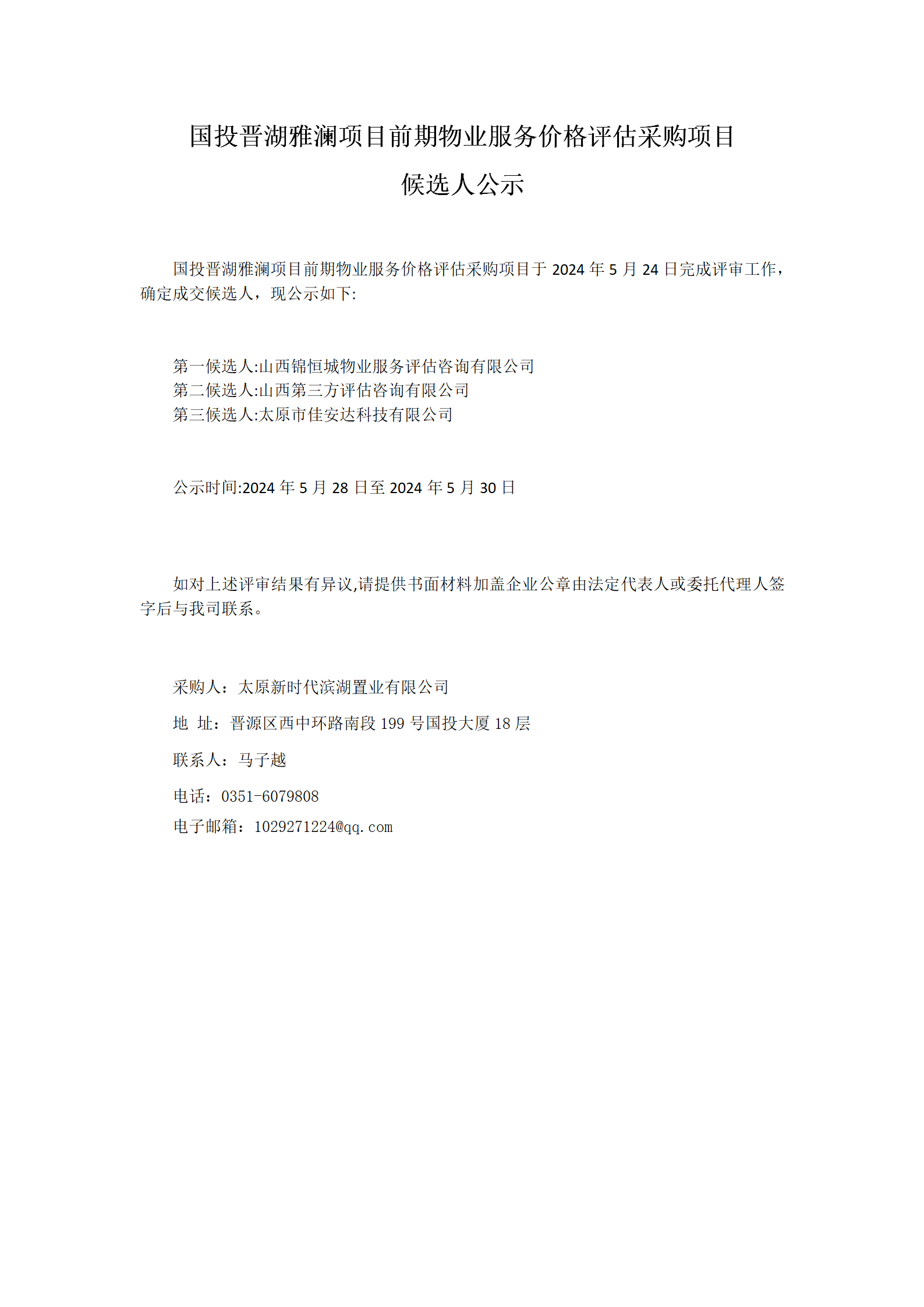 國投晉湖雅瀾項目前期物業(yè)服務價格評估采購項目候選人公示