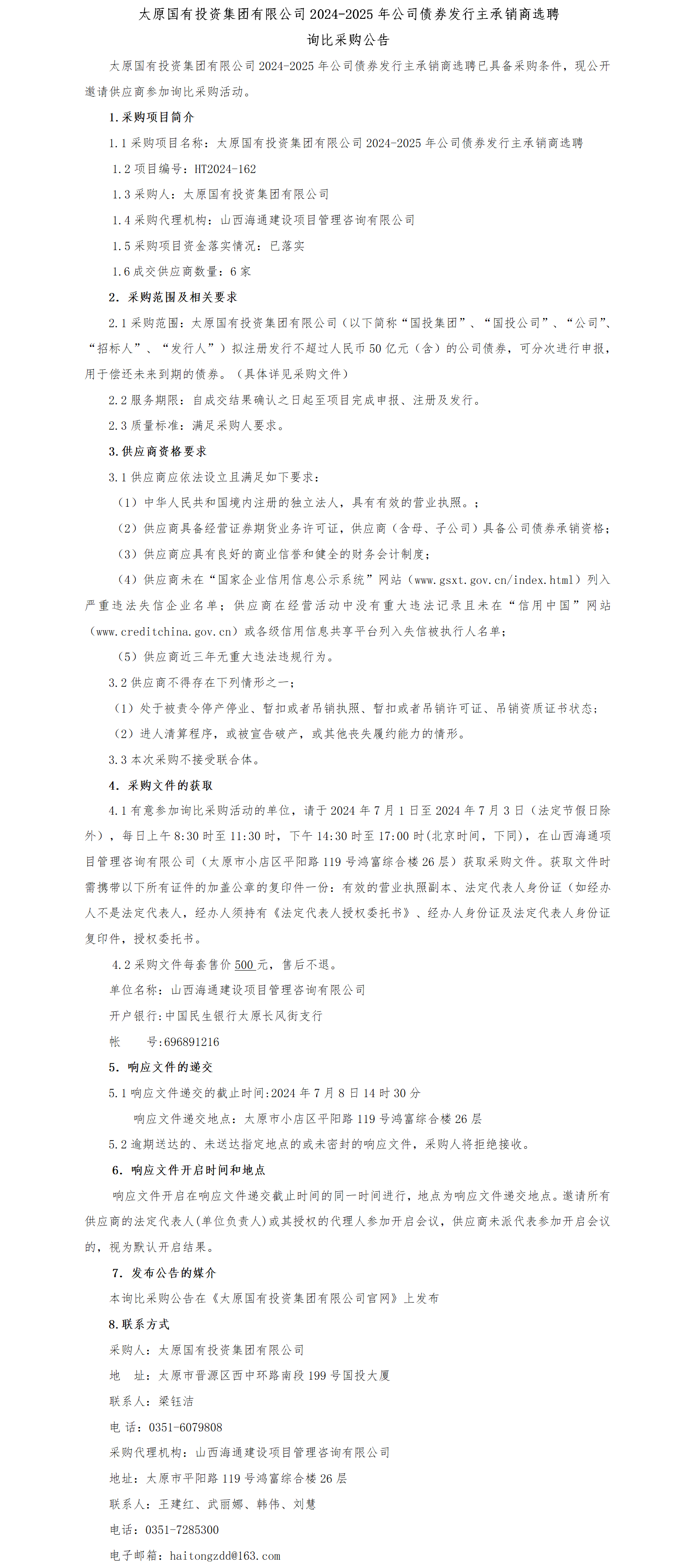 太原國有投資集團(tuán)有限公司2024-2025年公司債券發(fā)行主承銷商選聘 詢比采購公告