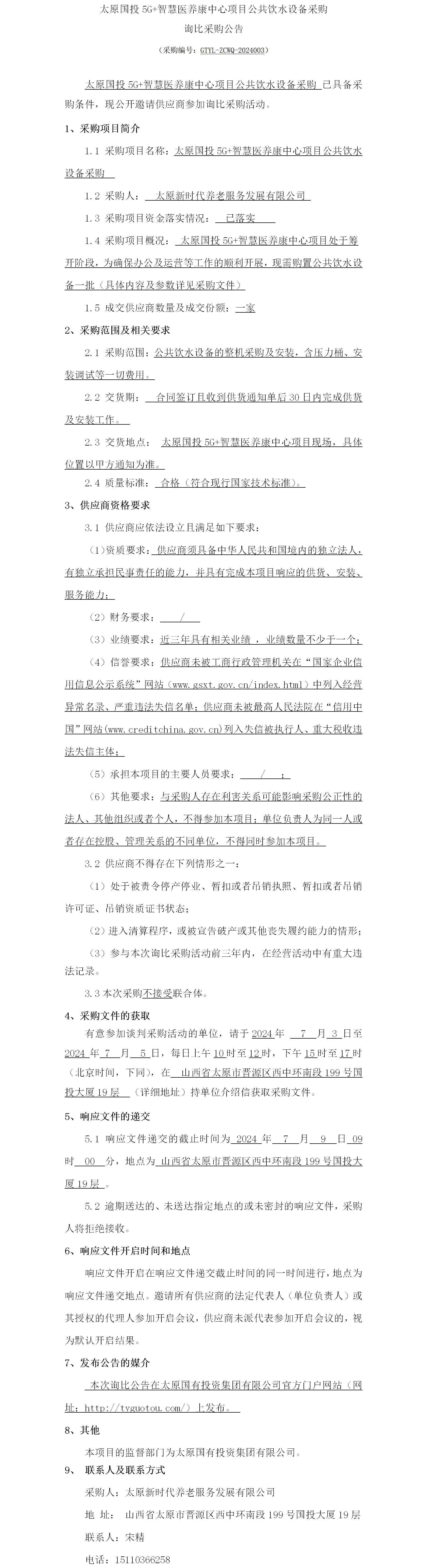 太原國(guó)投5G+智慧醫(yī)養(yǎng)康中心項(xiàng)目公共飲水設(shè)備采購(gòu)詢比采購(gòu)公告