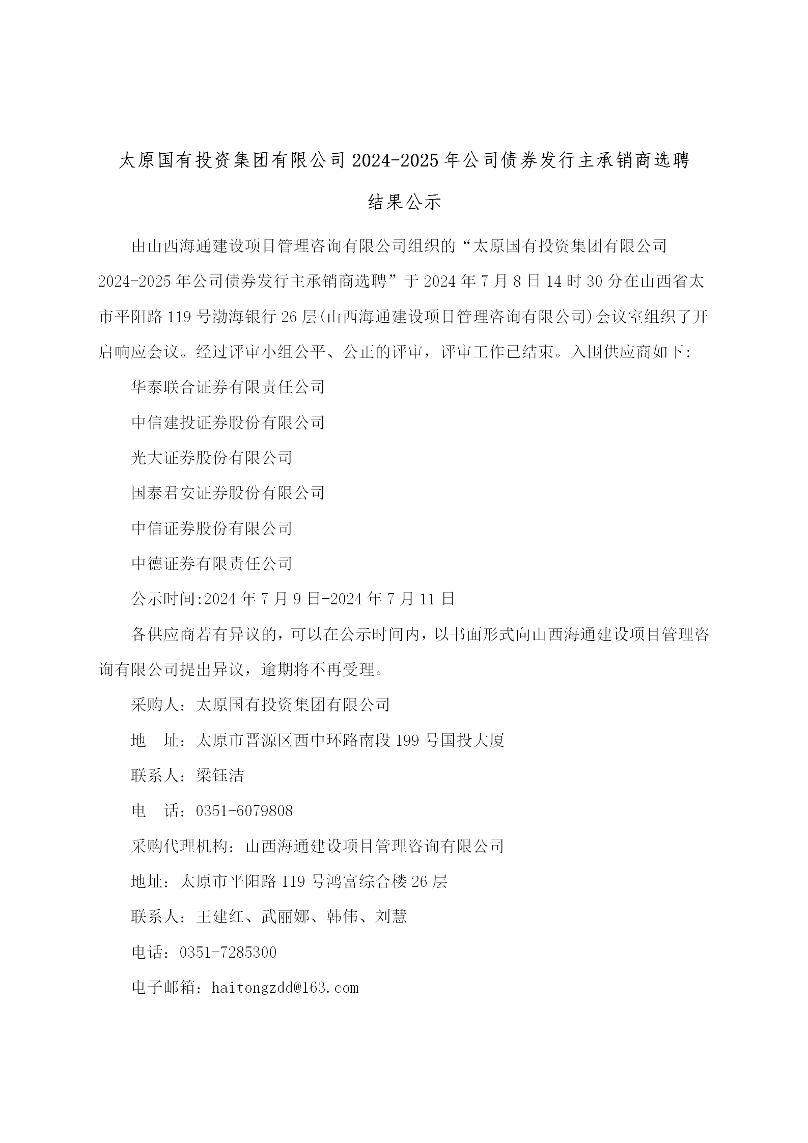 太原國有投資集團有限公司2024-2025年公司債券發(fā)行主承銷商選聘結(jié)果公示
