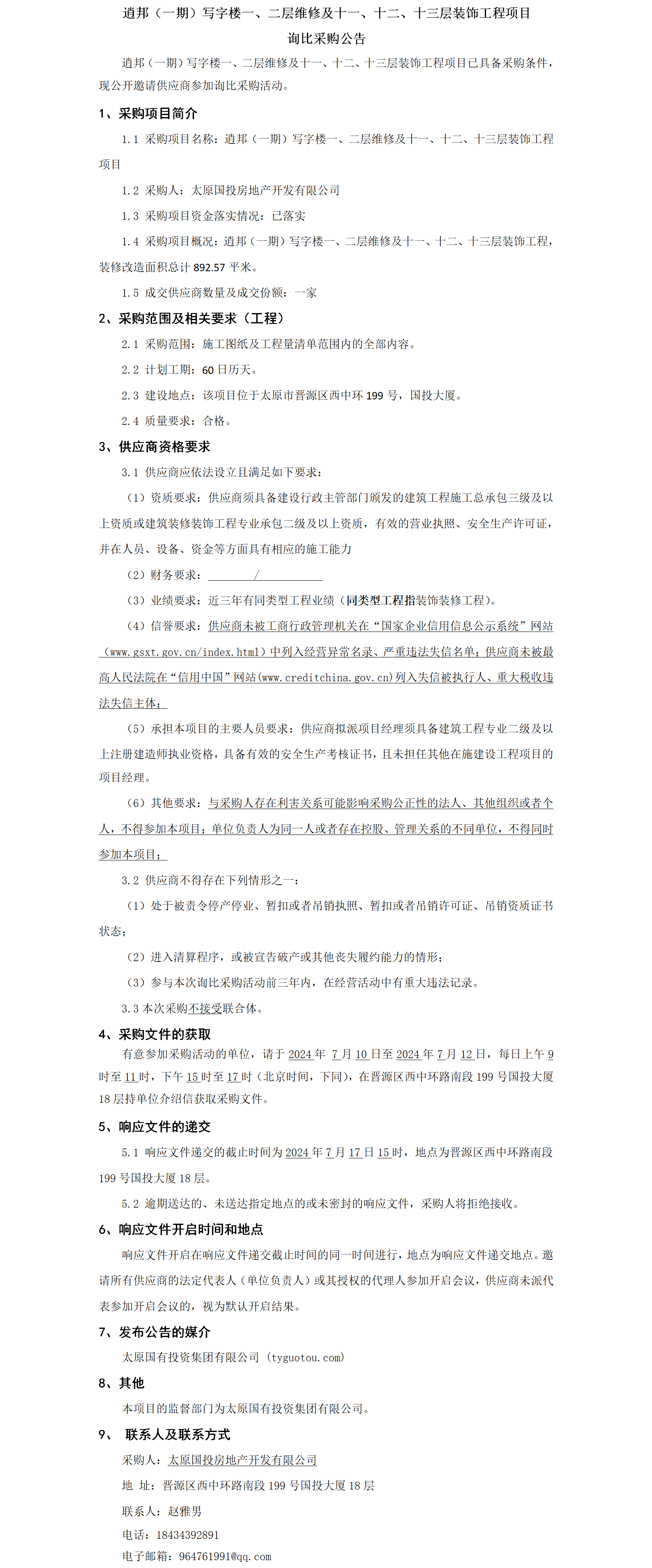 逍邦(一期)寫字樓一、二層維修及十一、十二、十三層裝飾工程詢比采購公告