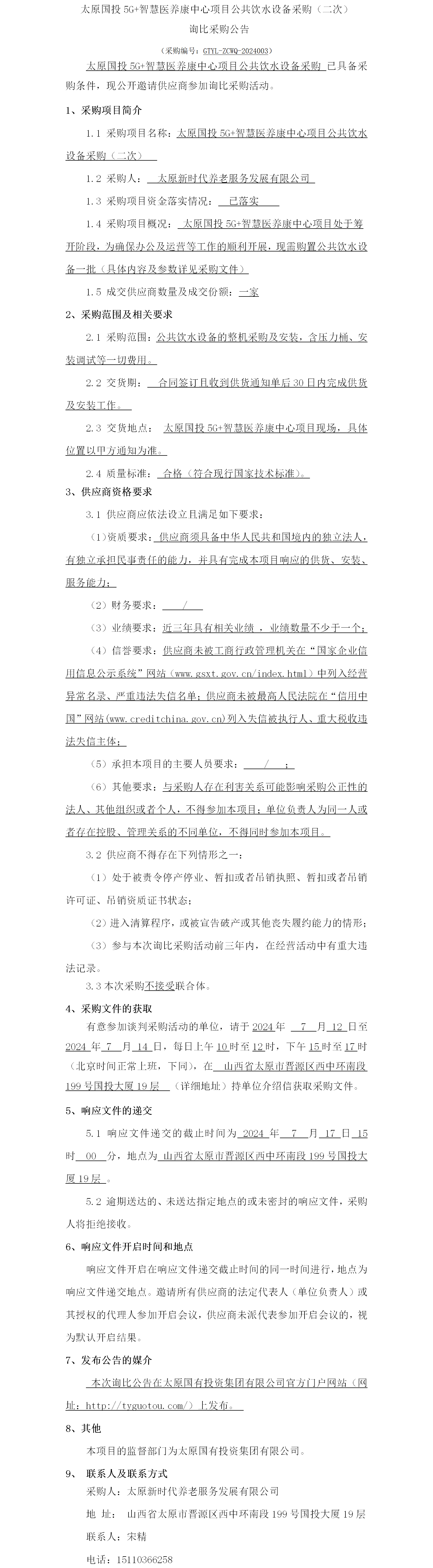 太原國投5G+智慧醫(yī)養(yǎng)康中心項目公共飲水設(shè)備采購(二次)詢比采購公告