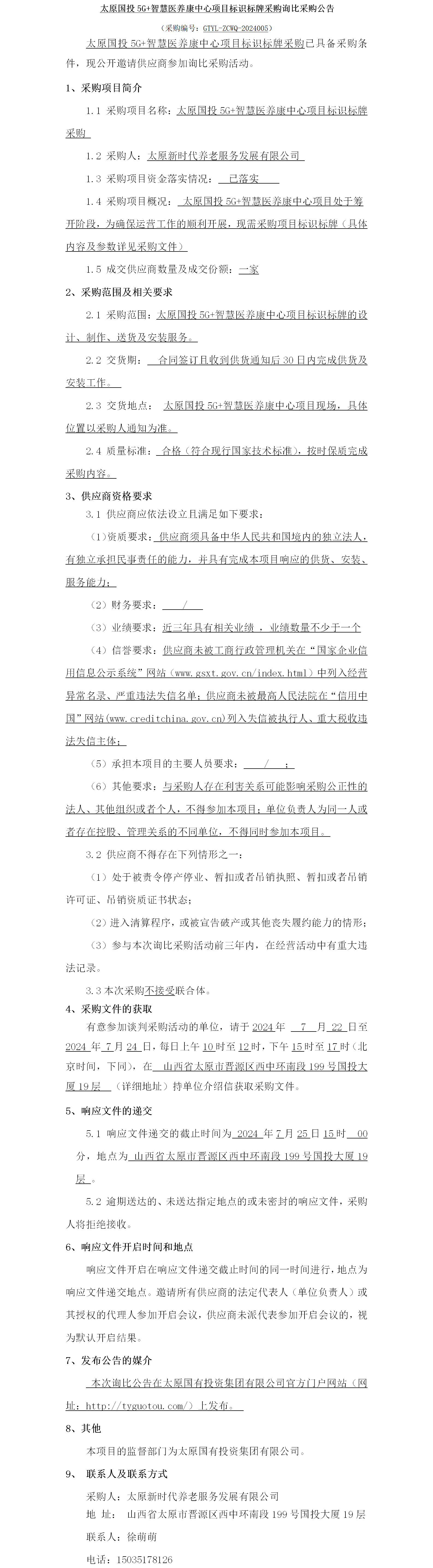 太原國(guó)投5G+智慧醫(yī)養(yǎng)康中心項(xiàng)目標(biāo)識(shí)標(biāo)牌采購(gòu)詢比采購(gòu)公告