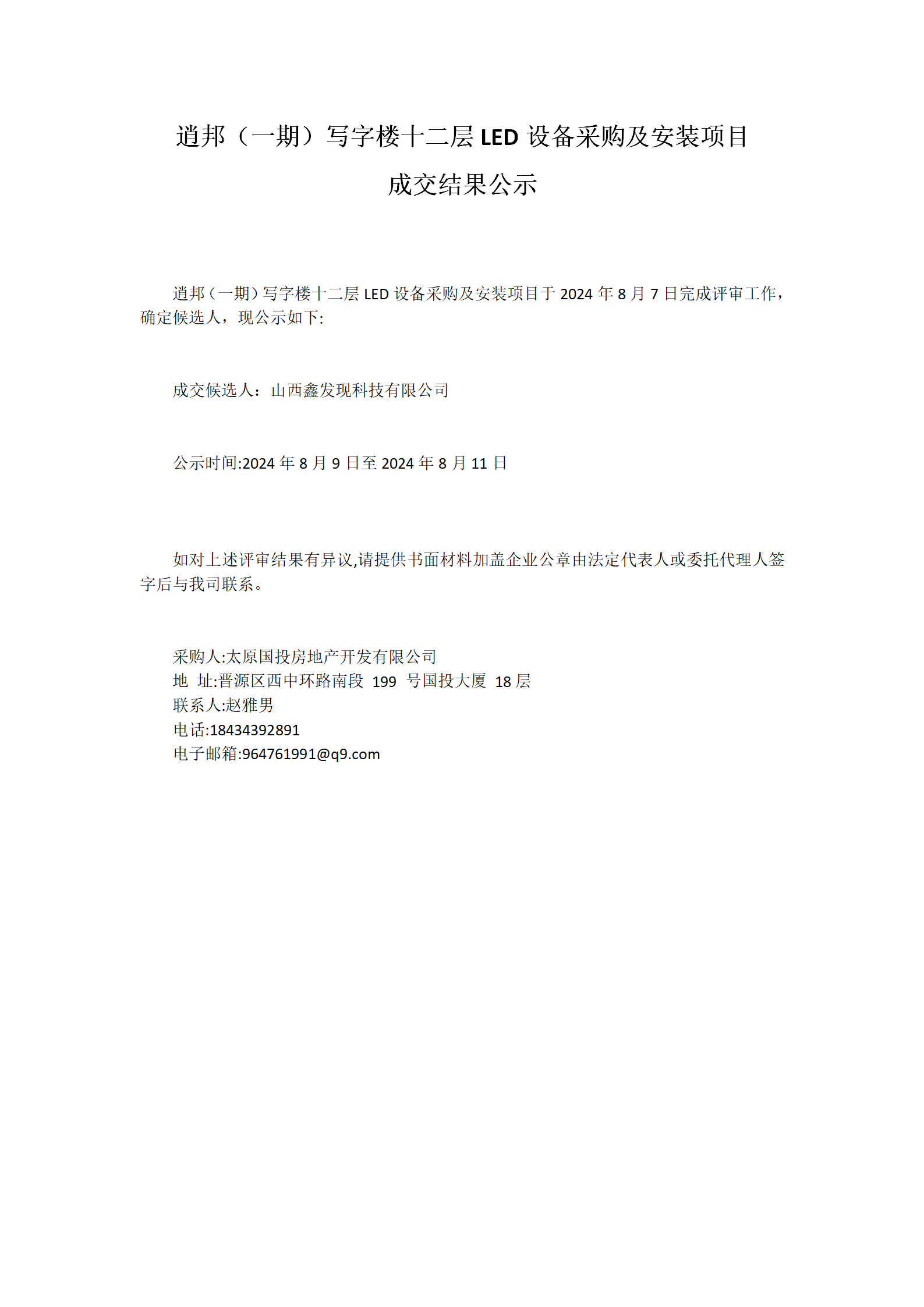 逍邦(一期)寫字樓十二層LED設(shè)備采購及安裝項(xiàng)目成交結(jié)果公示