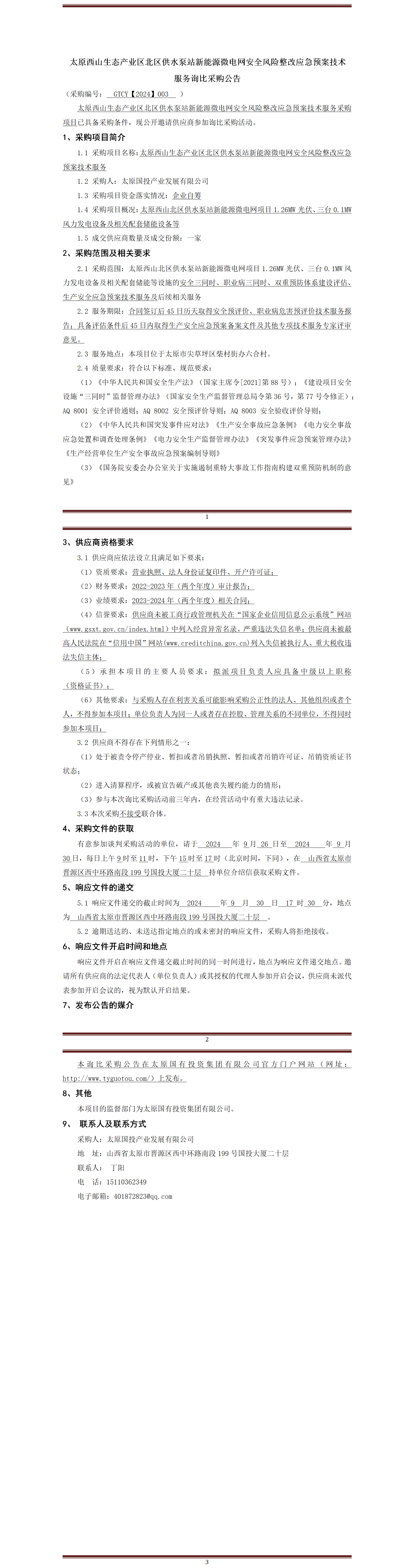 太原西山生態(tài)產(chǎn)業(yè)區(qū)北區(qū)供水泵站新能源微電網(wǎng)安全風(fēng)險(xiǎn)整改應(yīng)急預(yù)案技術(shù)服務(wù)詢比采購(gòu)公告