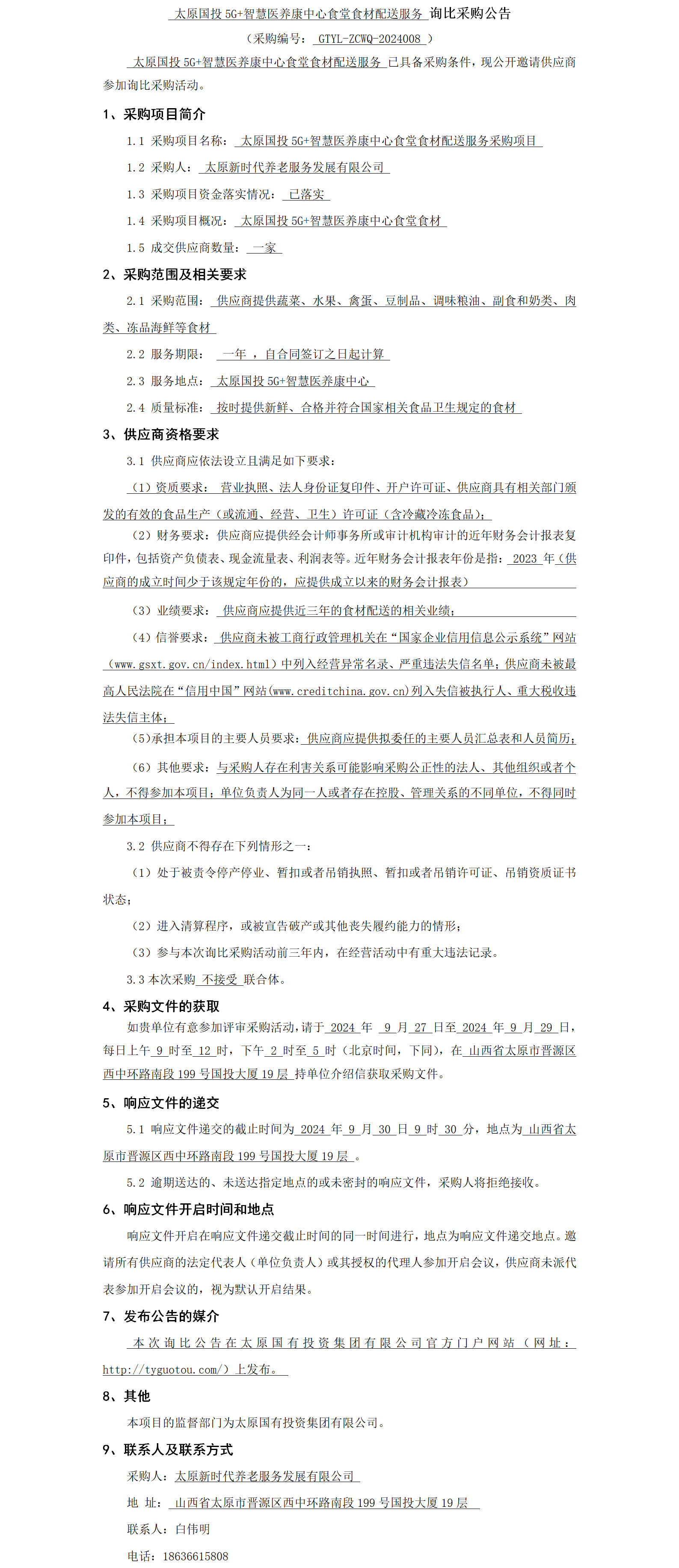 太原國投5G+智慧醫(yī)養(yǎng)康中心食堂食材配送服務詢比采購公告