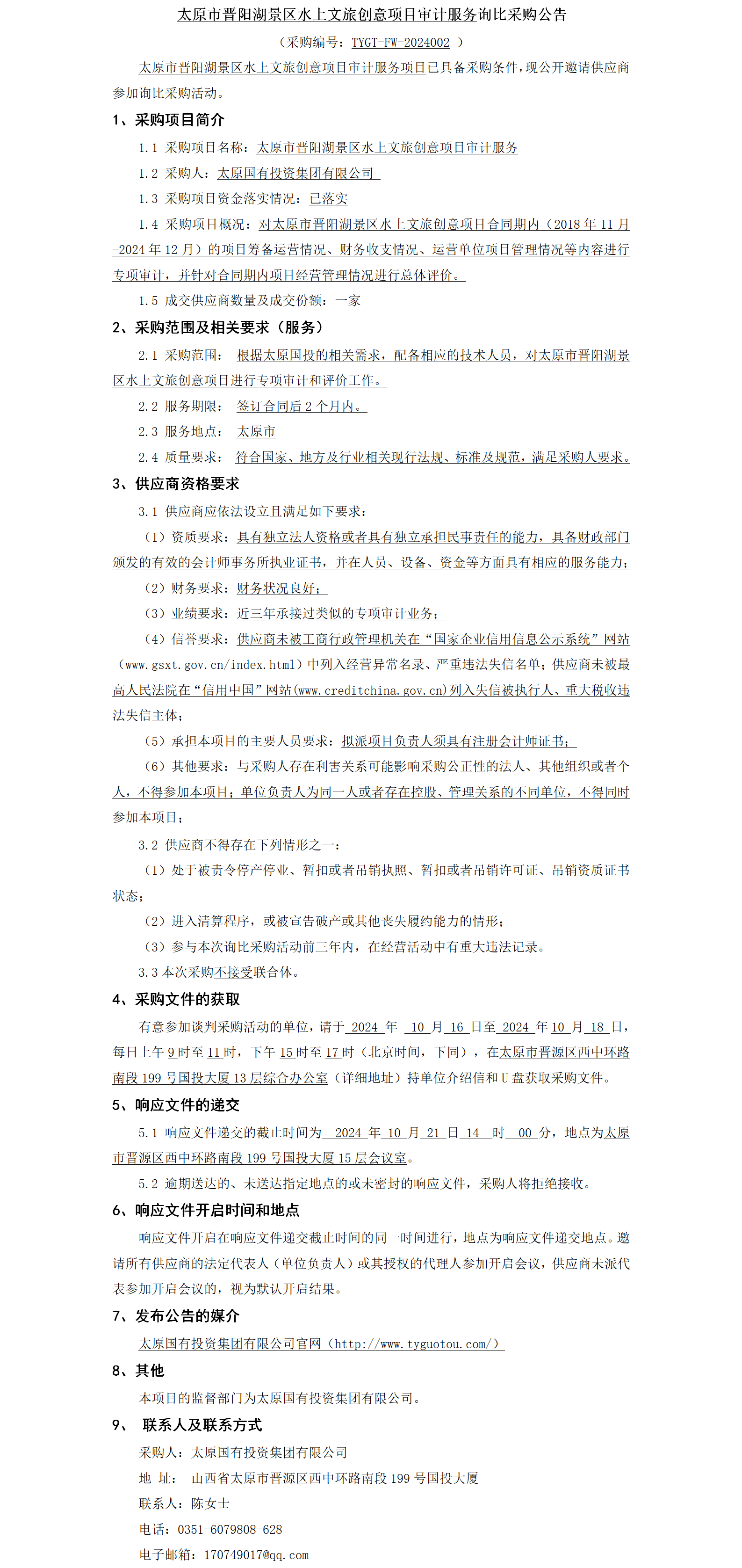 太原市晉陽湖景區(qū)水上文旅創(chuàng)意項目審計服務(wù)詢比采購公告