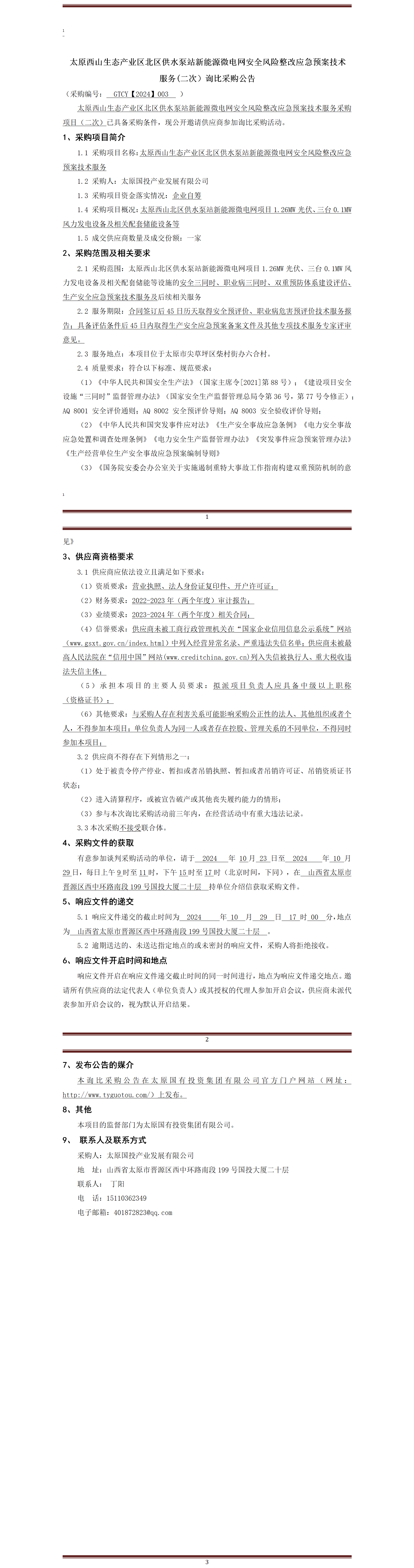 太原西山生態(tài)產(chǎn)業(yè)區(qū)北區(qū)供水泵站新能源微電網(wǎng)安全風(fēng)險(xiǎn)整改應(yīng)急預(yù)案技術(shù)服務(wù)(二次)詢比采購公告