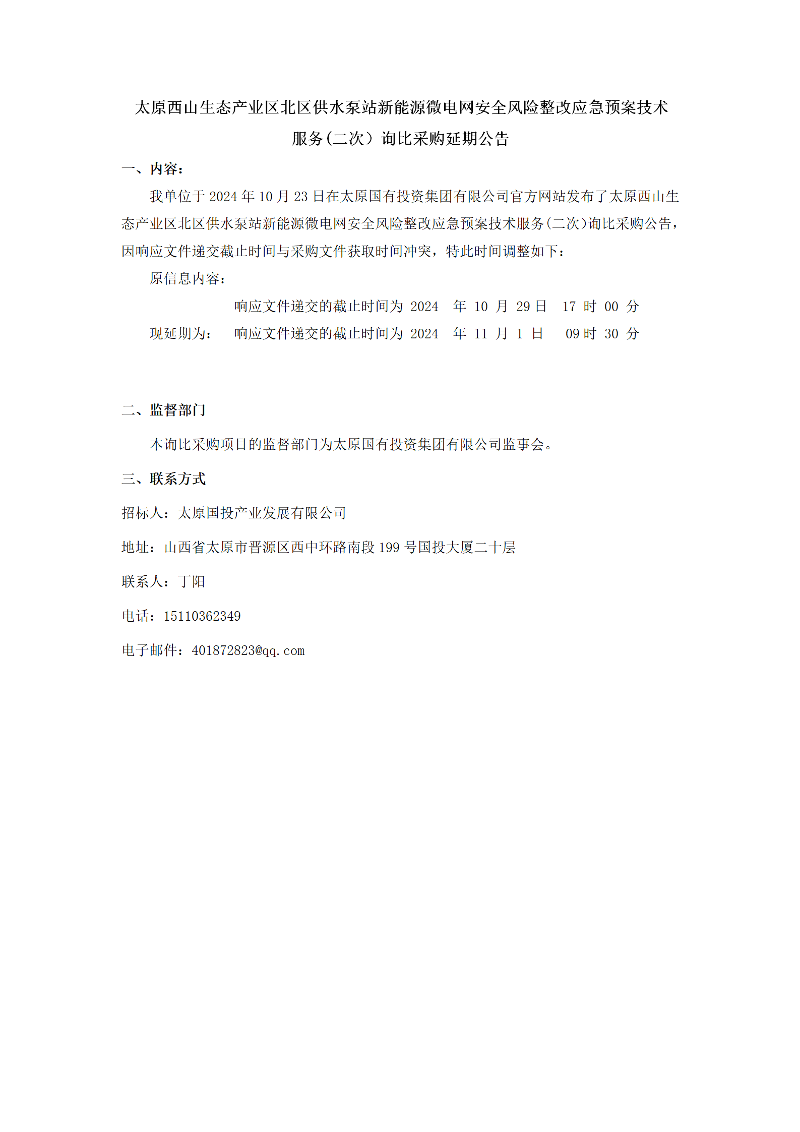 太原西山生態(tài)產(chǎn)業(yè)區(qū)北區(qū)供水泵站新能源微電網(wǎng)安全風險整改應急預案技術服務(二次)詢比采購延期公告