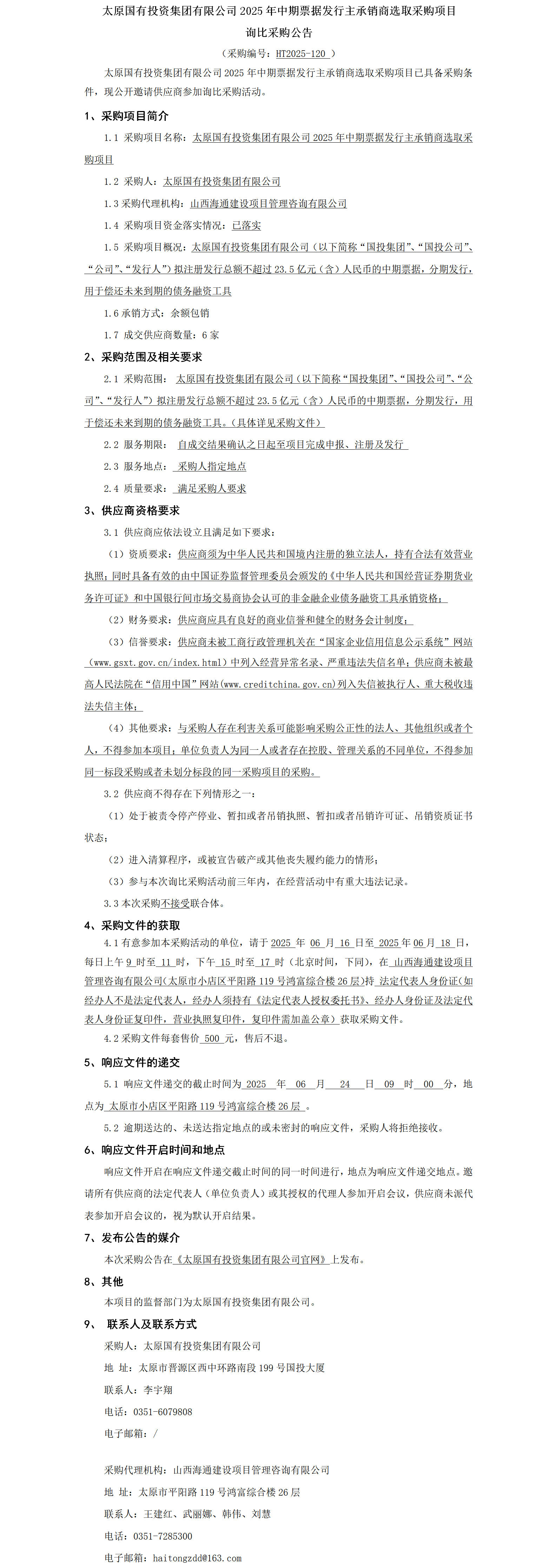 太原國有投資集團有限公司2025年中期票據(jù)發(fā)行主承銷商選取采購項目詢比采購公告