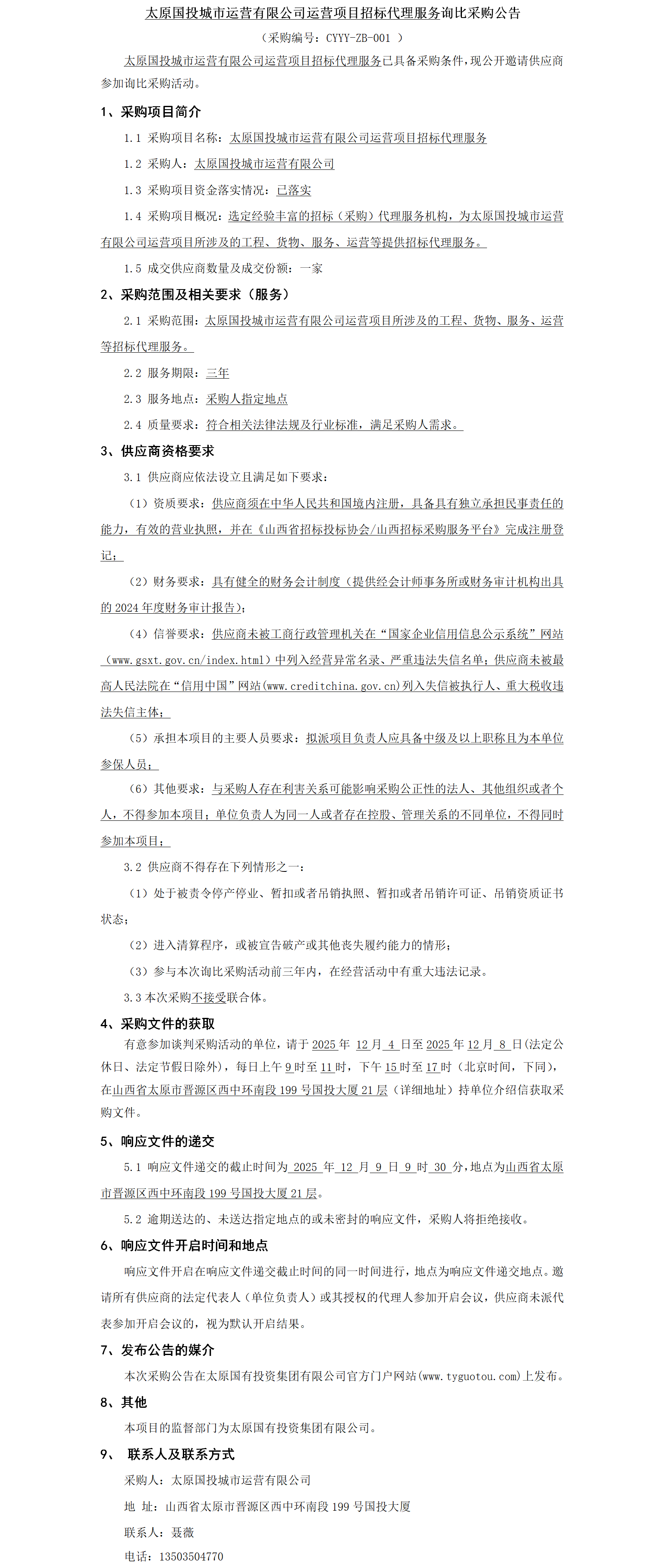 太原國(guó)投城市運(yùn)營(yíng)有限公司運(yùn)營(yíng)項(xiàng)目招標(biāo)代理服務(wù)詢(xún)比采購(gòu)公告