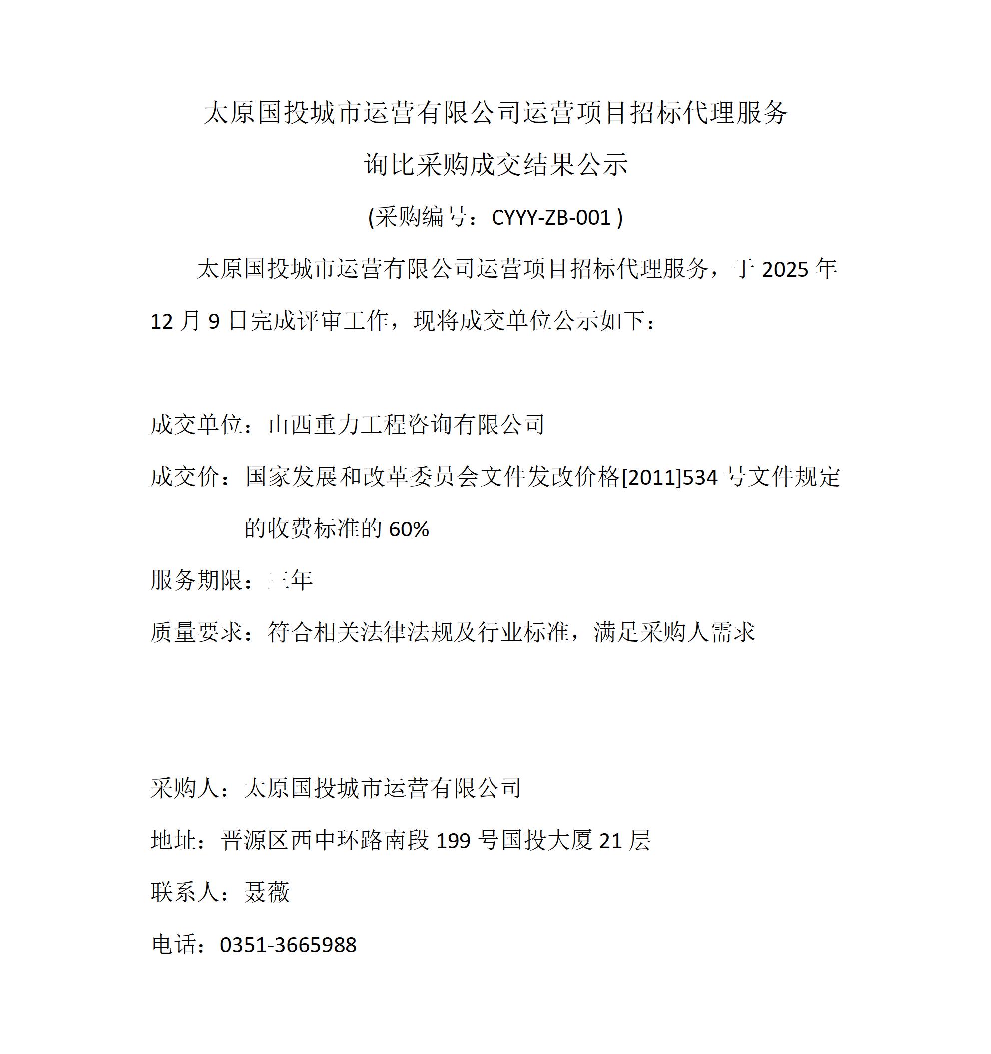 太原國投城市運(yùn)營有限公司運(yùn)營項(xiàng)目招標(biāo)代理服務(wù)采購項(xiàng)目詢比采購成交結(jié)果公示