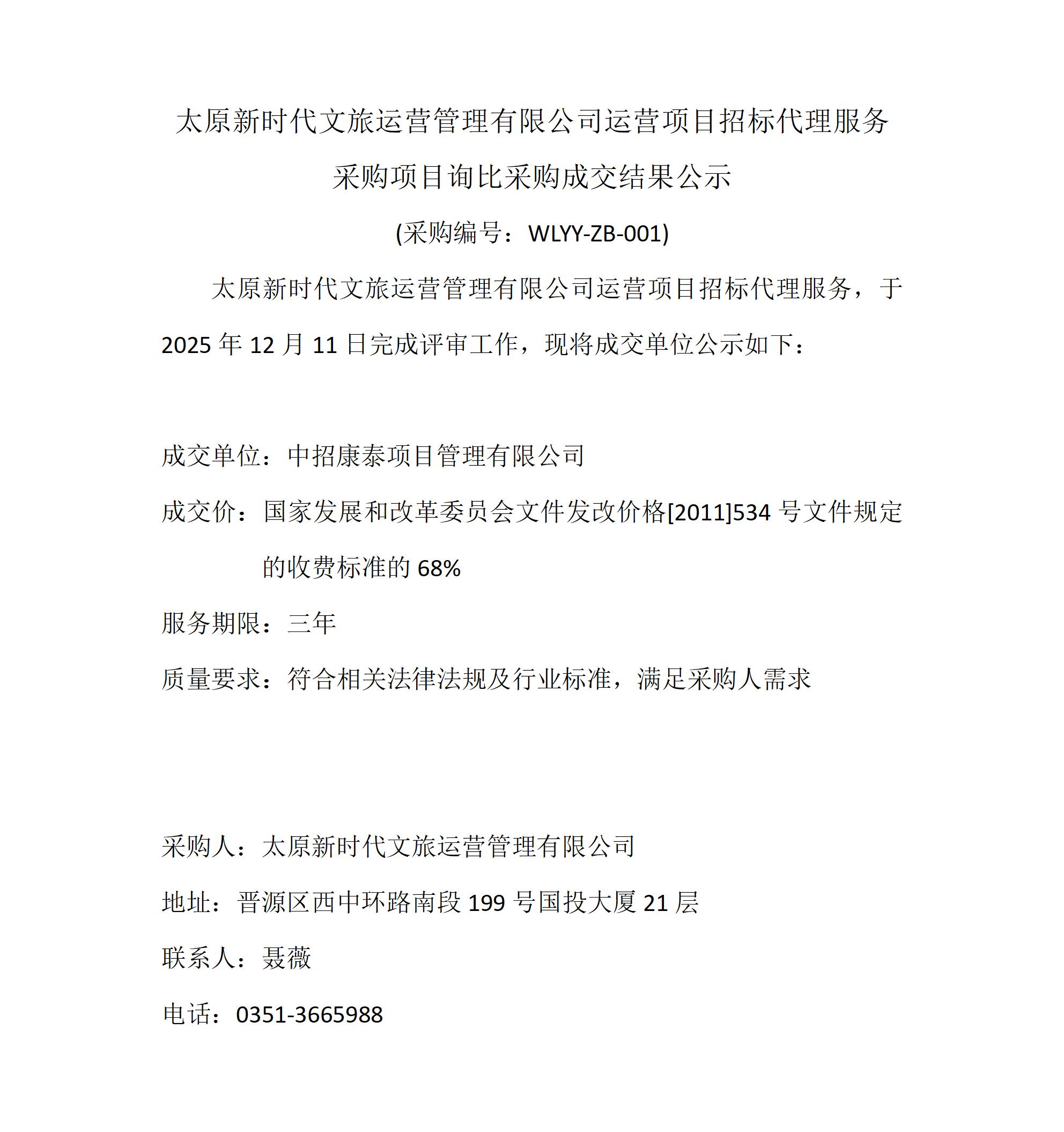 太原新時代文旅運(yùn)營管理有限公司運(yùn)營項目招標(biāo)代理服務(wù)采購項目詢比采購成交結(jié)果公示